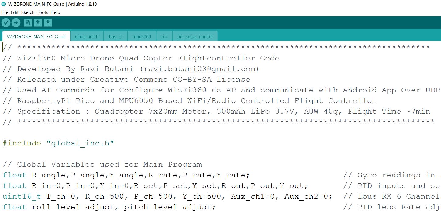 - WIZDRONE_MAIN_FC_Quad.ino - main flight controller firmware code, this code loops 250 times in a second.